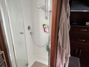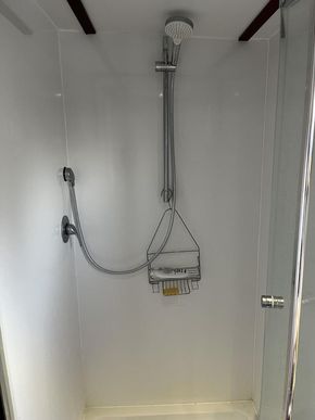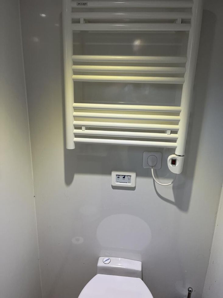 The interior layout includes two double cabins, each with its own private bathroom with shower and electric toilet, ensuring comfort and privacy for occupants. This level of finish and functionality makes the Entente 150 ideal for both residential use and long cruises.